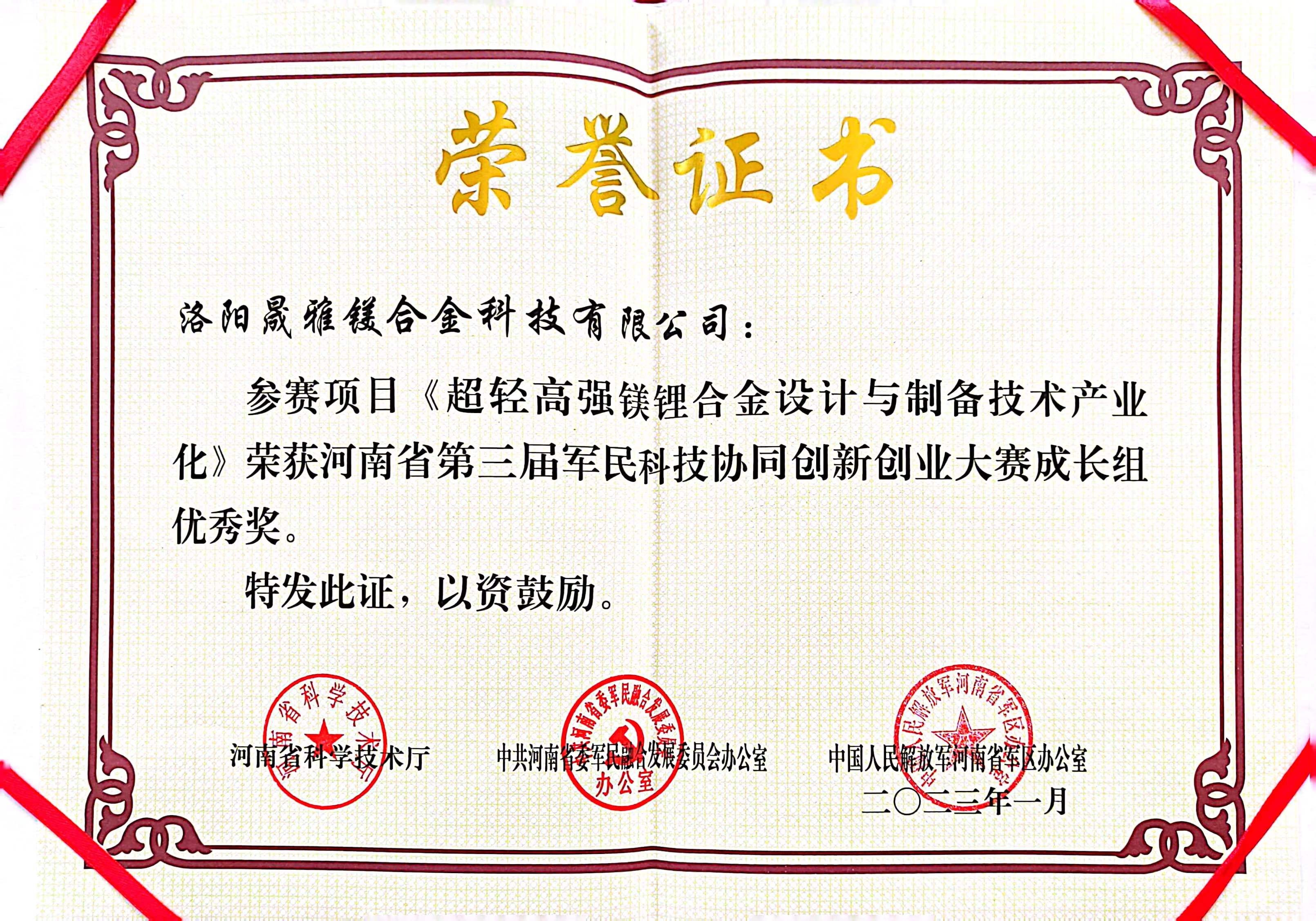 近日,我公司與上海交通大學(xué)劉教授團(tuán)隊(duì)合作的項(xiàng)目《超輕高強(qiáng)鎂鋰合金設(shè)計(jì)與制備技術(shù)產(chǎn)業(yè)化》,在河南省第三屆軍民科技協(xié)同創(chuàng)新創(chuàng)業(yè)大賽中,榮獲成長組***獎(jiǎng)。